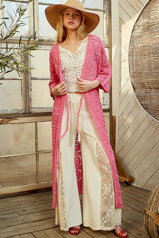 POL Tied Crochet 3/4 Sleeve Longline Cardigan