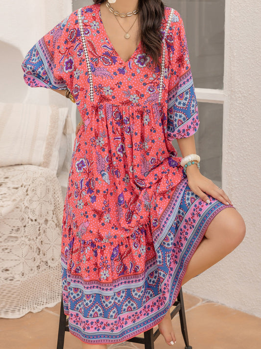 Printed Notched Three-Quarter Sleeve Mini Dress