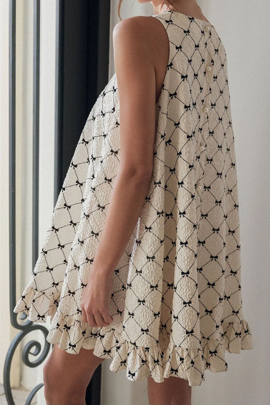 Ruffled Hem Bow Print Sleeveless Mini Dress