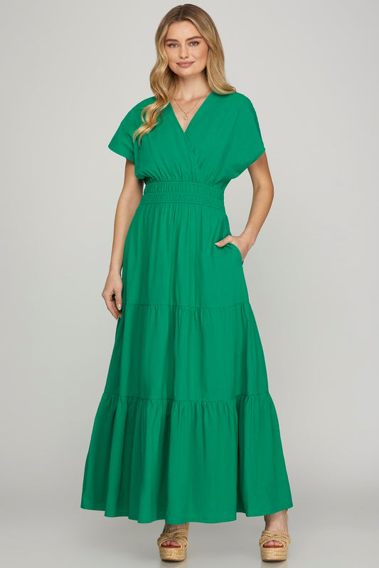 She + Sky Surplice Short Sleeve Tiered Maxi Dress With Pockets