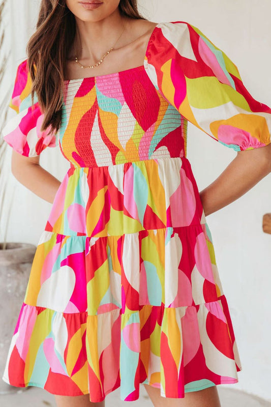 Smocked Eyelet Square Neck Puff Sleeve Mini Dress