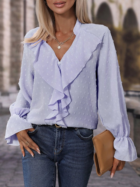 Swiss Dot Notched Neck Flare Sleeve Blouse