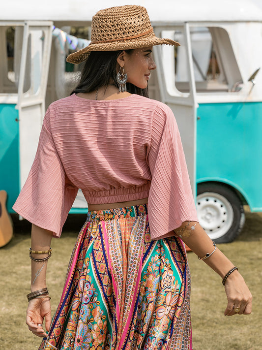 Textured Tie Neck Three-Quarter Sleeve Blouse