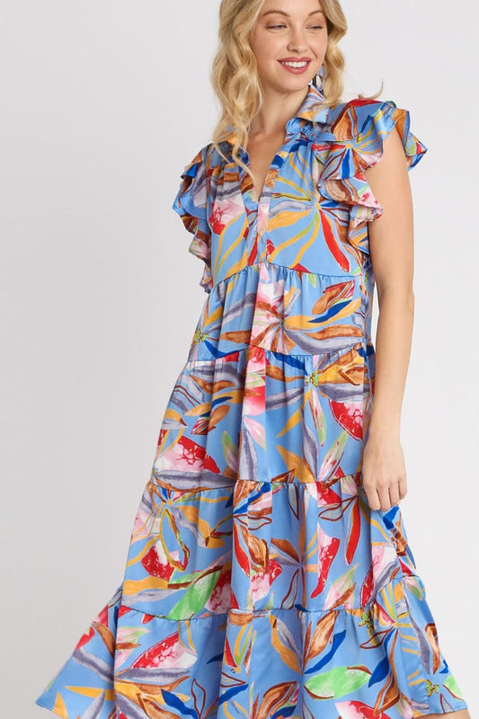 Umgee Full Size Leaf Print Double Layered Ruffle Sleeve Tiered Midi Dress Plus Size