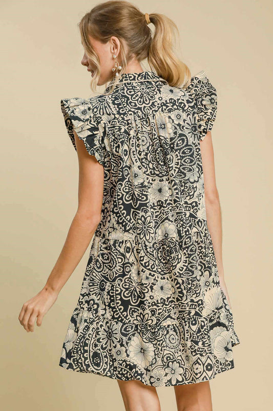 Umgee Full Size Printed Ruffle Cap Sleeve Babydoll Dress Plus Size