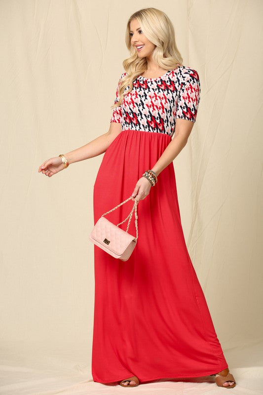 Celeste Full Size Houndstooth Round Neck Short Sleeve Maxi Dress Plus Size