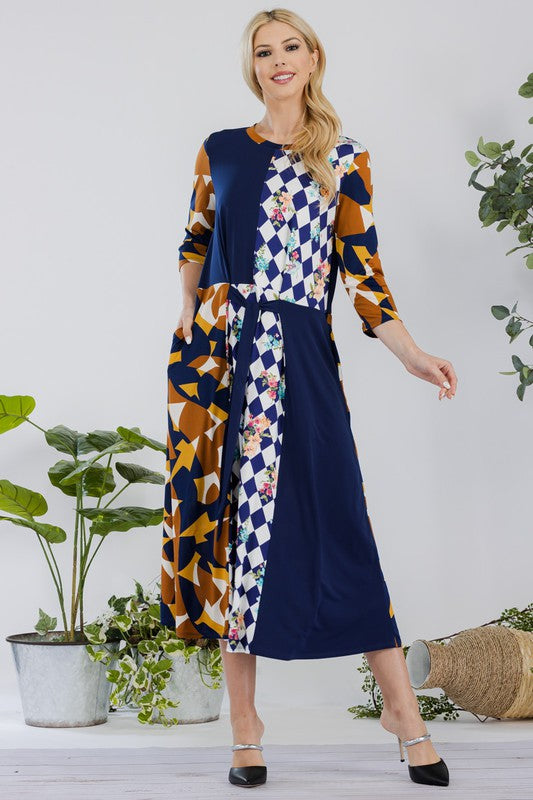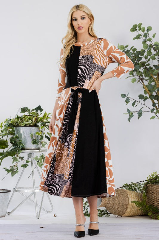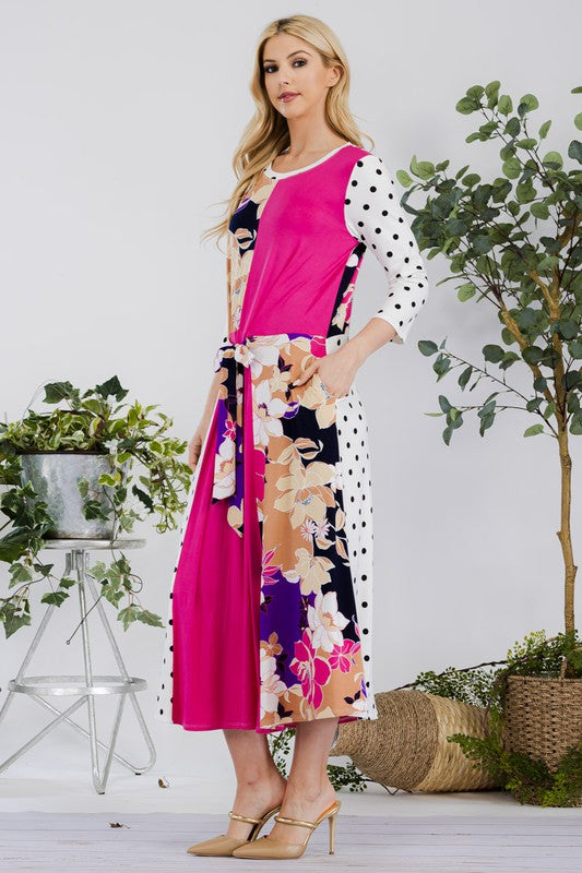 Celeste Full Size Multi Pattern Front Tie Midi Dress Plus Size