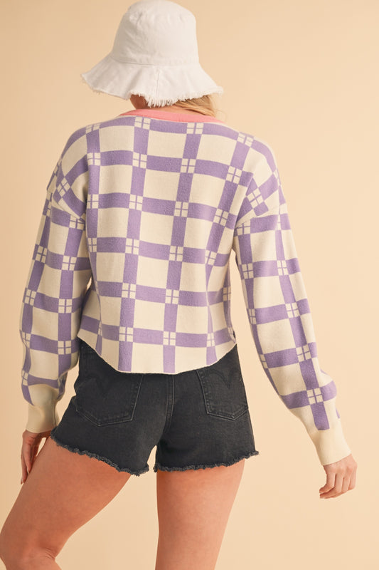Aemi + Co Plaid Round Neck Drop Shoulder Cropped Sweater