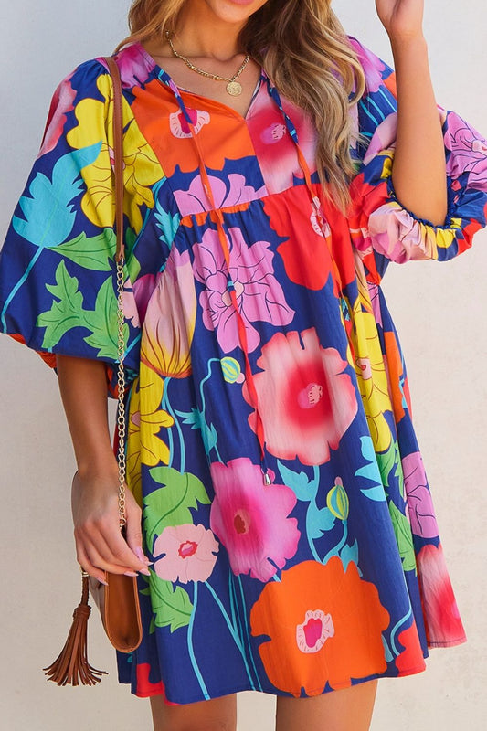 Floral Ruffle Puff Sleeve Tie Neck Mini Dress
