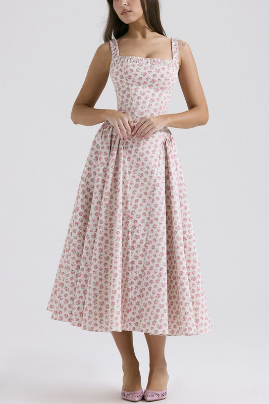 Floral Smocked Square Neck Puff Short Sleeve Midi Dress