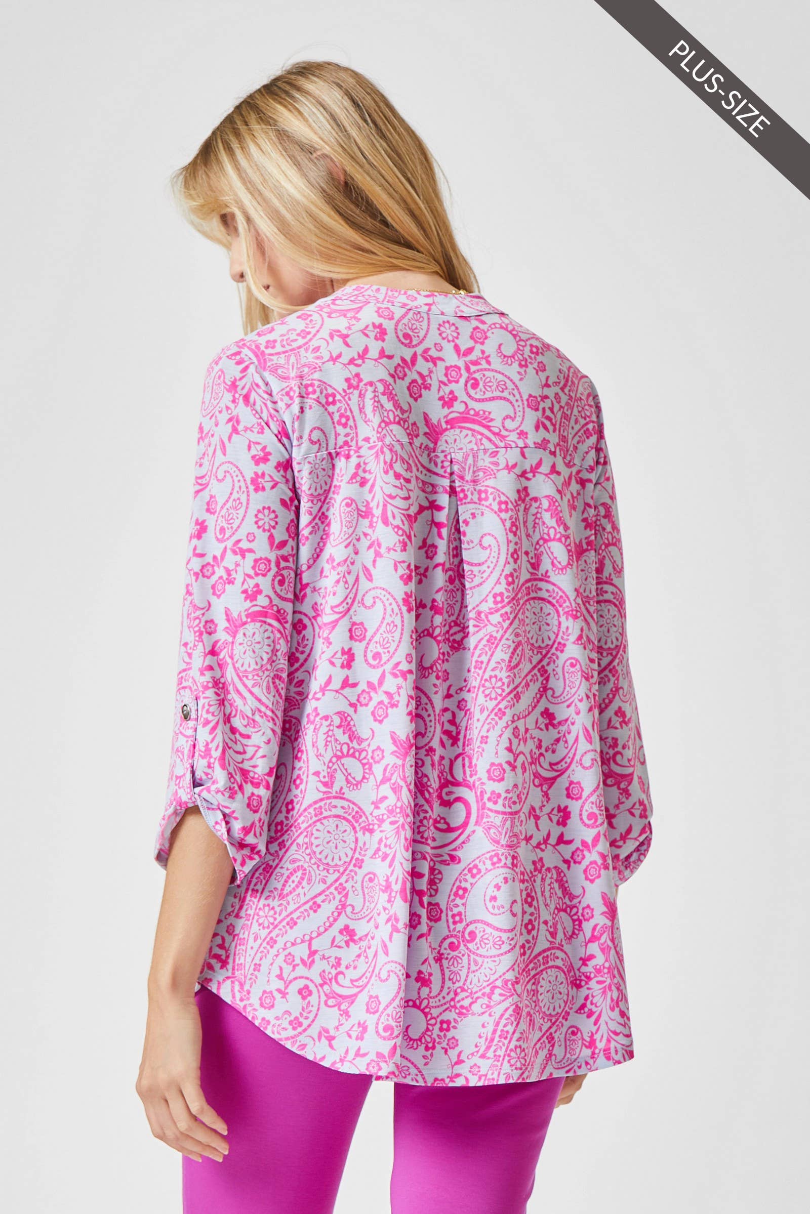 Our signature Lizzy top features poly blend which features luxurious softness with lightweight, wrinkle free comfort. This easy care fabric top is travel friendly, cooler than linen and other materials which makes your perfect ON THE GO wear. Lizzy top also features china collar neckline with 3/4" length sleeves with tab details. The fit is relaxed, flowy fit with slight high low.